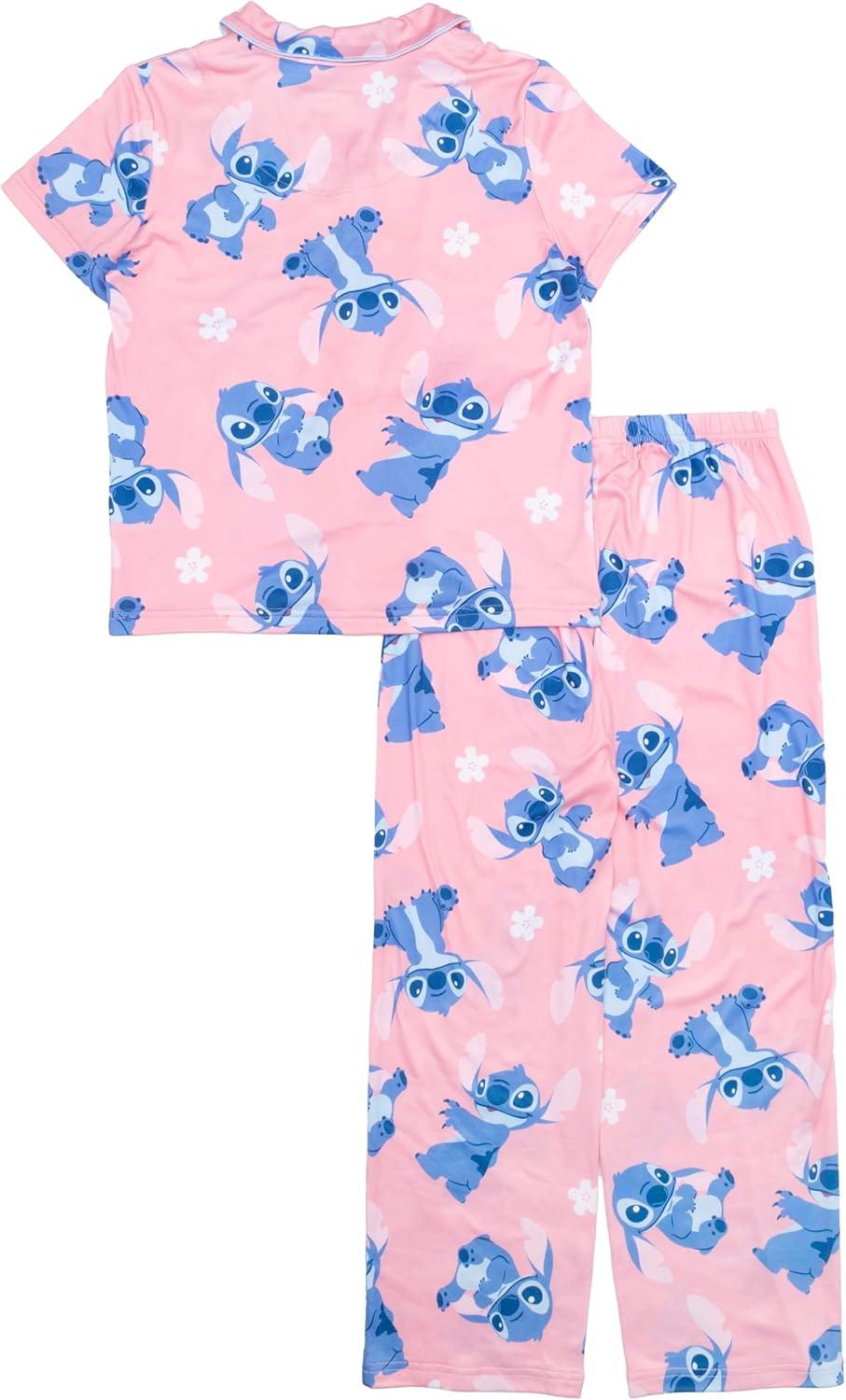 Disney Minnie Mouse Girls' 2-Piece Loose-fit Button Down Matching Pajama Set, Soft & Cute for Kids(Stitch Flowers)