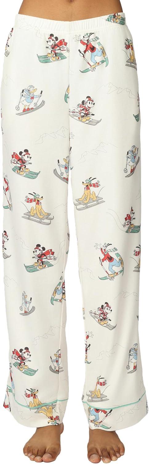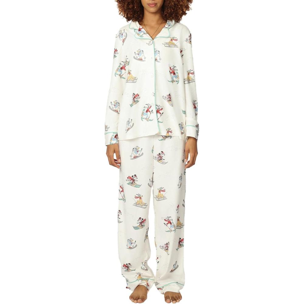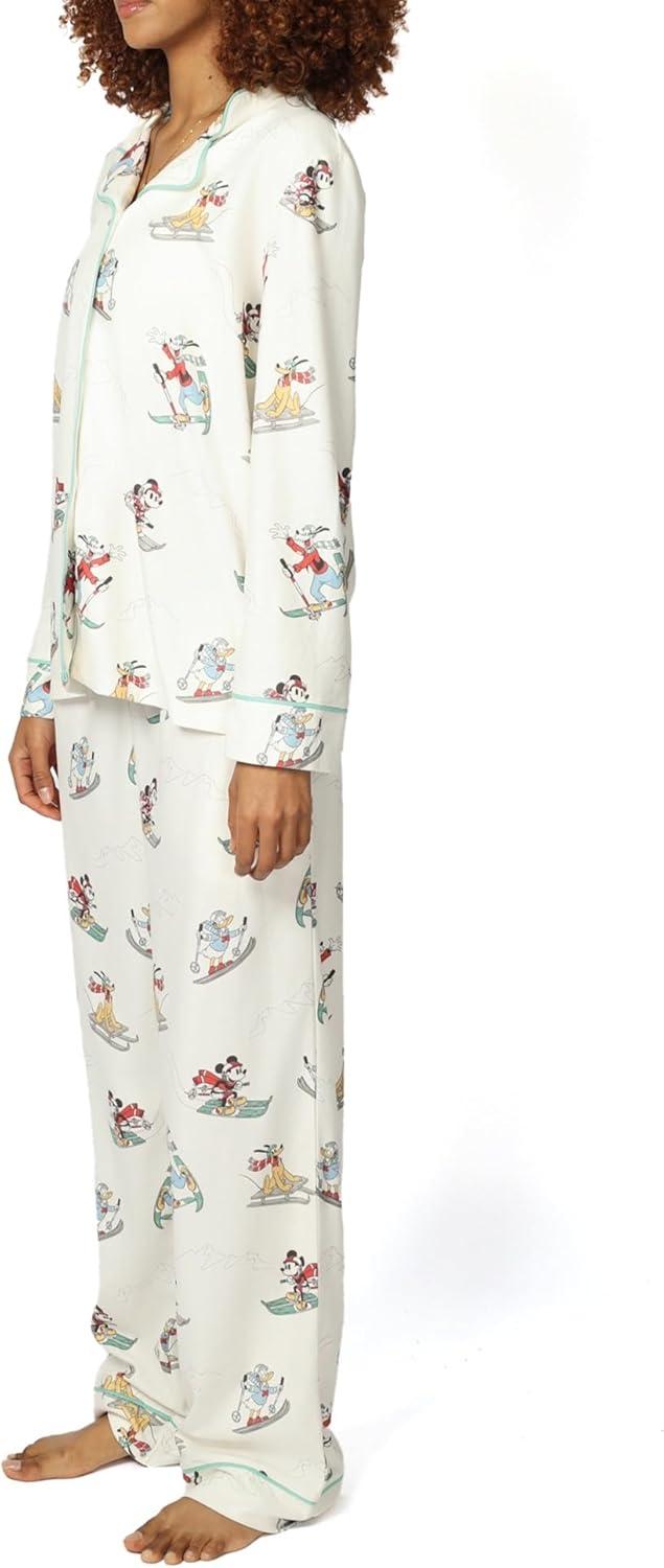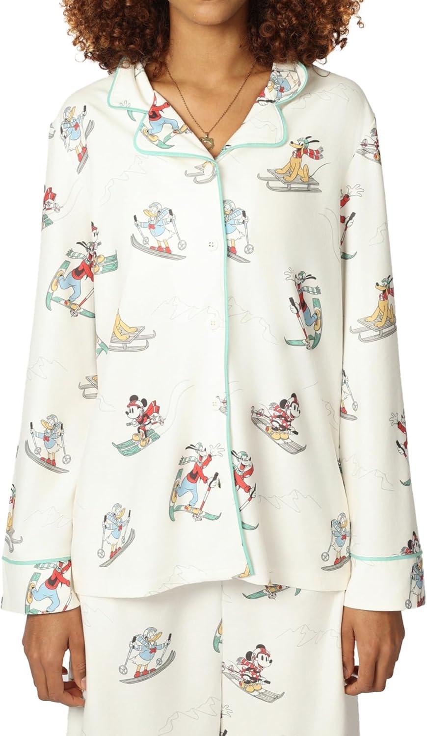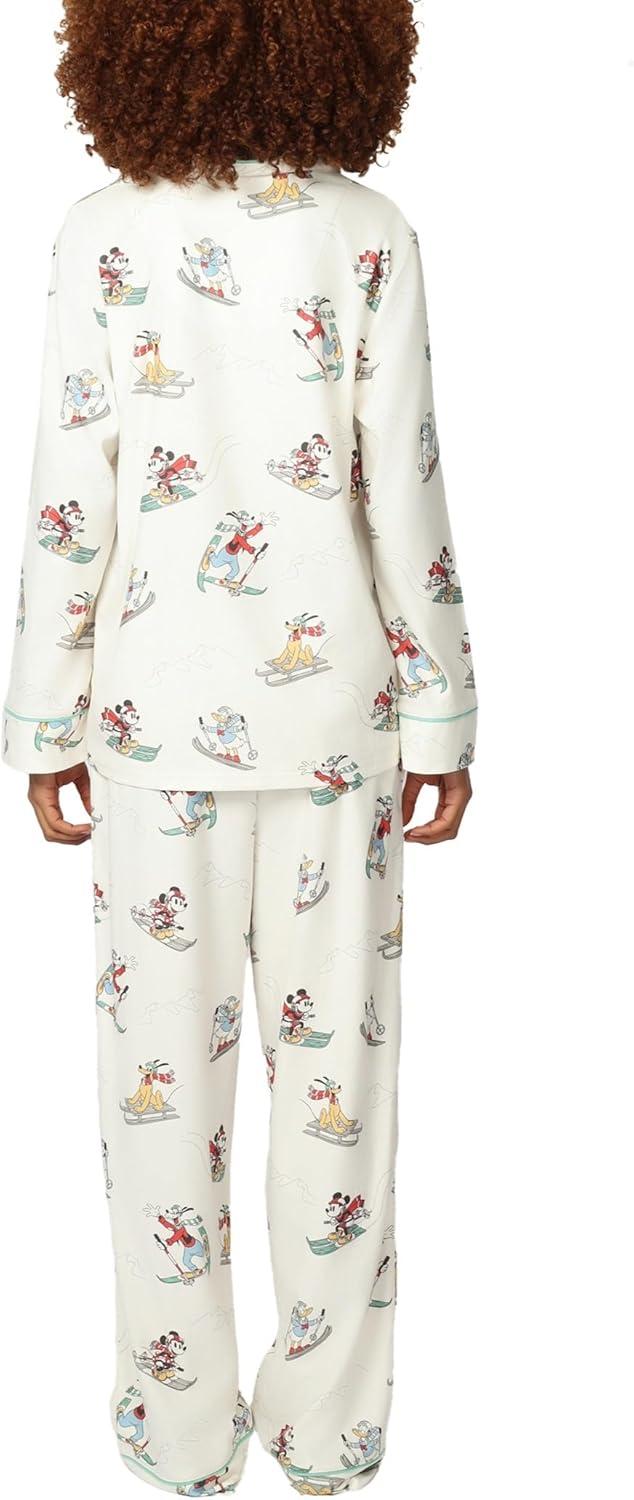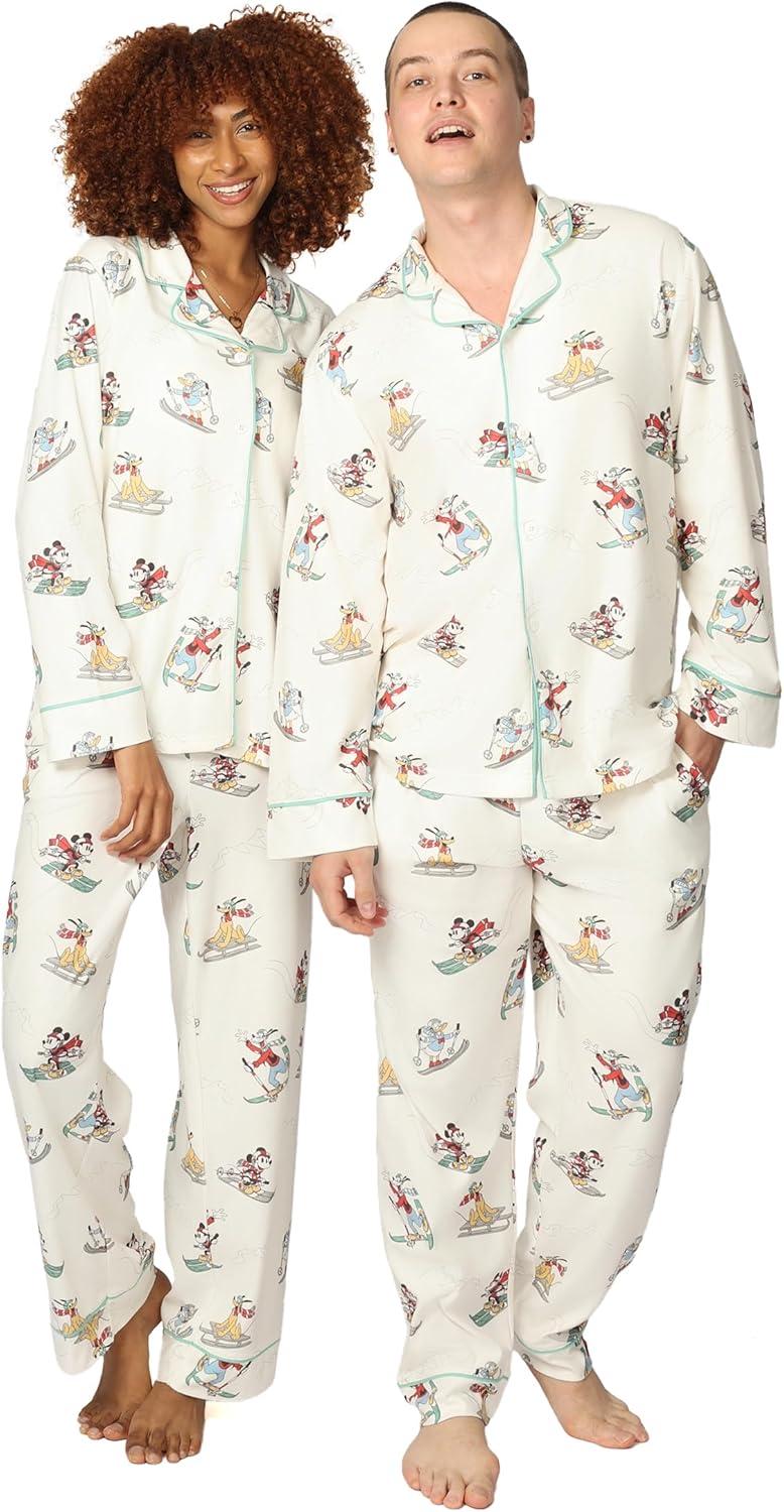 Disney unisex-adult Men & Women 2-piece Button Down Pajama Set, Soft & Comfortable Nightwear for Adults(W_mickey and Friends Ski)
